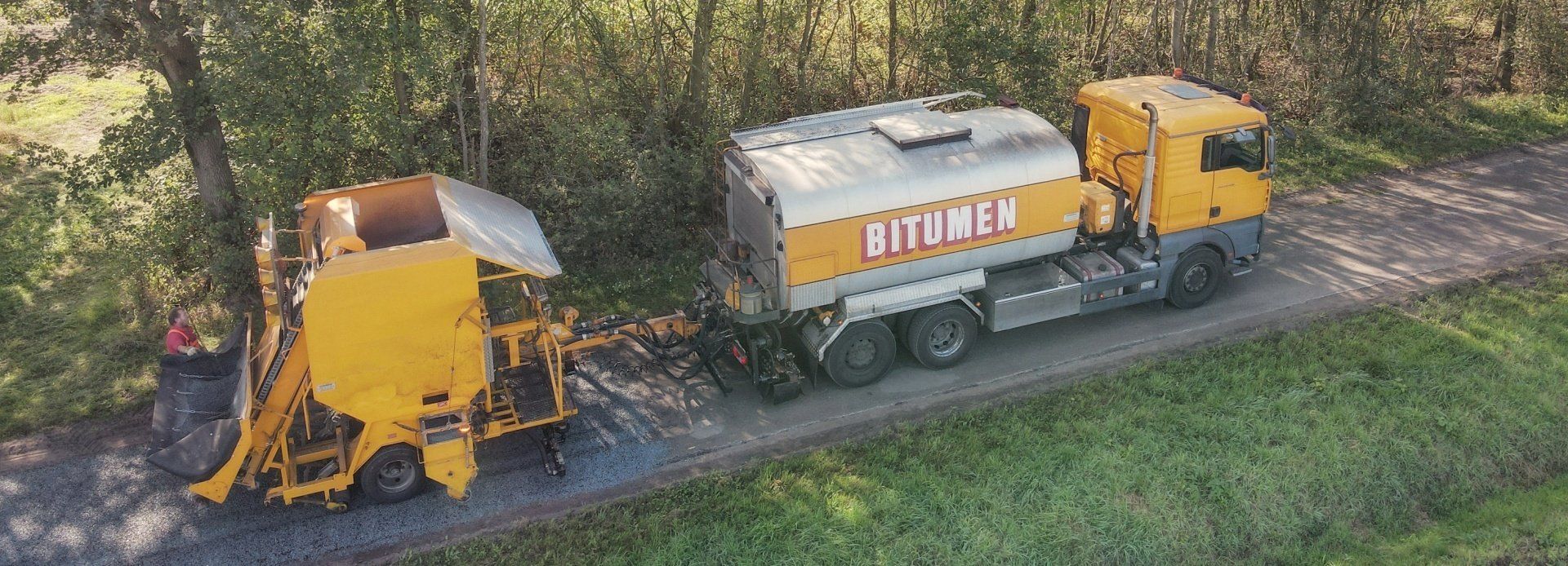It has an insulated, heatable tank that contains the bituminous binder. From here the binder is pumped to the spray boom and applied to the road. Then, from a funnel-shaped grit trough, grit is scattered over the sprayed surface in doses via a discharge roller. The road surface is checked for pavement damage by one or two employees from the moving repair train. The operator stations are located in a safe, shielded part. As soon as a damaged area is seen, the nozzles of the spray bar are adjusted using a hand lever according to the required length and width. The slider on the grit spreader is then automatically opened and closed again at these points. Due to the low fall height of the chippings, it is immediately integrated into the binder film. The hydraulic roller tubes press the chippings into the binder film and smooth the affected areas.
