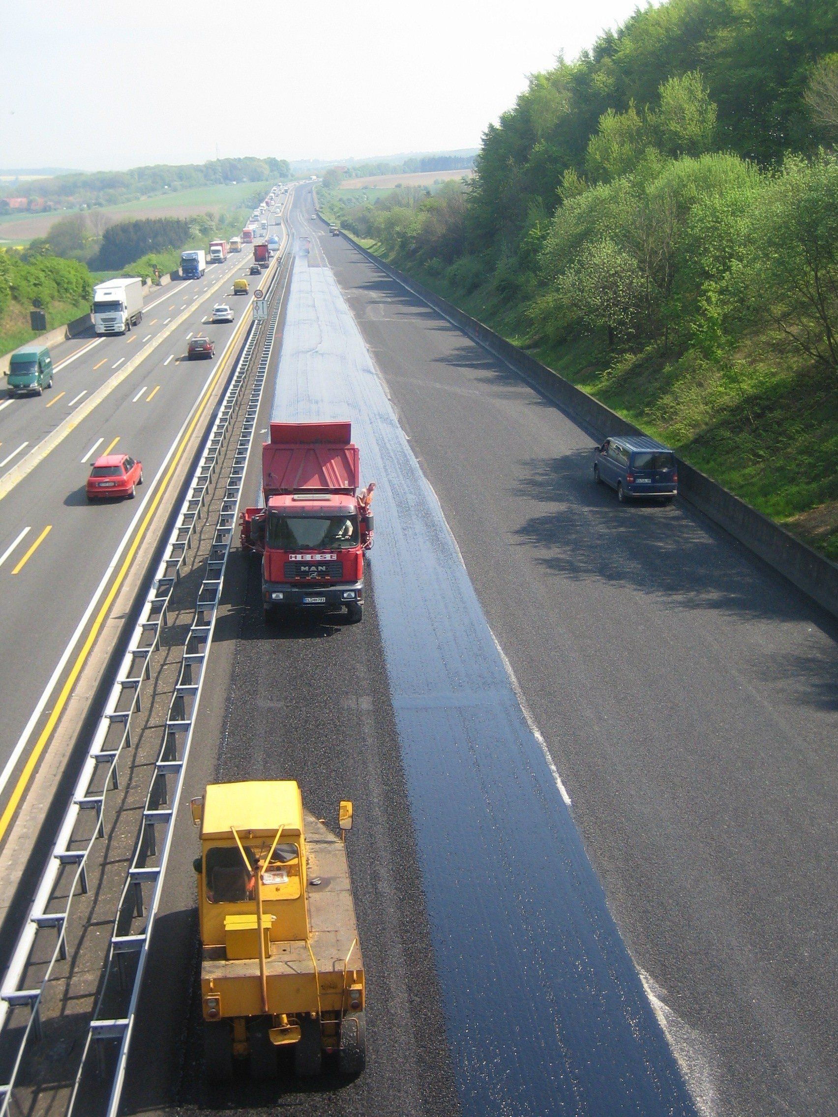 Vervolgens wordt de nieuwe toplaag met een finisher op de zo geproduceerde SAMI-laag aangebracht. Door de hitte en het walsen van het gemengde materiaal wordt het membraan weer gesmolten en wordt een deel van het sterk elastomere bindmiddel iets naar boven geduwd in het onderste gedeelte van de nieuwe toplaag, waardoor de holten in dit deel volledig worden gevuld. Deze zone is nu in staat om trekspanning op te vangen.