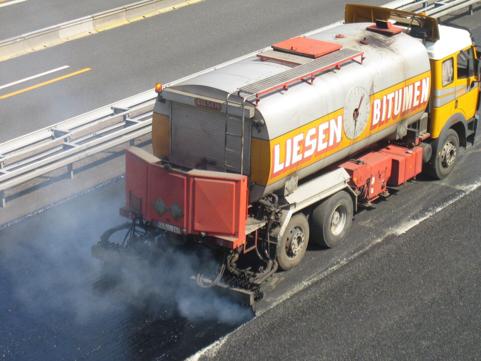 Auf die so hergestellte SAMI-Schicht wird dann die neue Deckschicht mit einem Fertiger aufgebracht. Durch die Wärme und das Walzen des Mischgutes wird die Membrane wieder angeschmolzen und ein Teil des hoch Elastomeren Bindemittels geringfügig nach oben in den untersten Bereich der neuen Deckschicht gedrängt, wodurch die Hohlräume in diesem Teil vollständig verfüllt werden. Diese Zone ist nun in der Lage, Zugspannungen aufzunehmen.